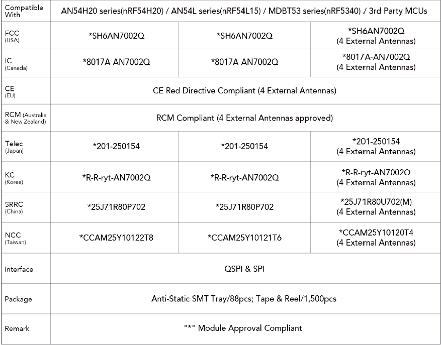* Certifications: FCC, IC, CE, Telec (MIC), KC, SRRC, NCC, RCM, WPC